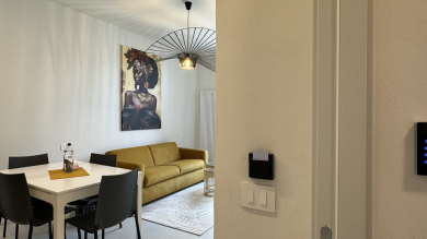 L’appartamento affaccia parzialmente sulla via Guido Monaco (la camera da letto e la cucina) e parzialmente sul cortile interno.